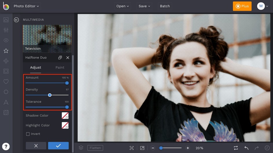 The Amount slider controls the opacity of the effect, while the Density slider refers to how condensed or spread apart the dots are. This means you can slide the Density slider to the left for dots that are further apart, or to the right to make the dots closer together. The Tolerance slider controls where the dots are present on your photo. More tolerance gives you more clusters of dots in the darker areas of the image, while less tolerance keeps the clusters of dots to a minimum.