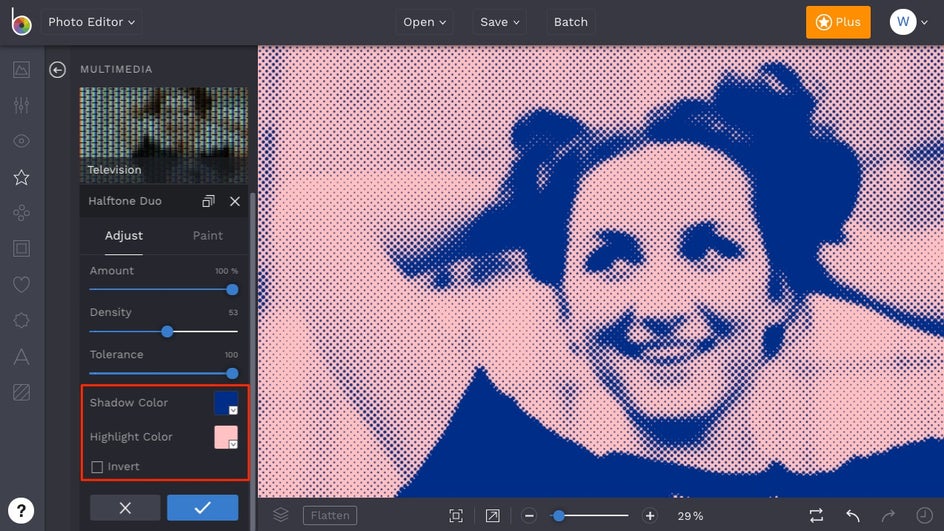 The Shadow Color and Highlight Color settings will work together to take your image from completely halftone to a halftone duotone. You’ll also notice an Invert option, which allows you to essentially invert the colors. Check the box to see which look you like the most.