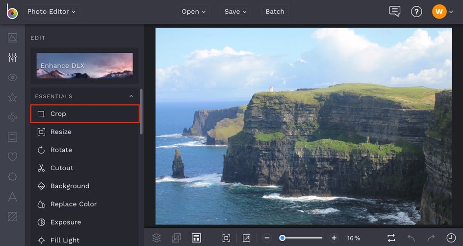 You'll find the Crop tool in the Edit tab on the left, under the Essentials category. Simply choose from the dropdown menu of Aspect Ratio presets, or type in your desired crop dimensions.