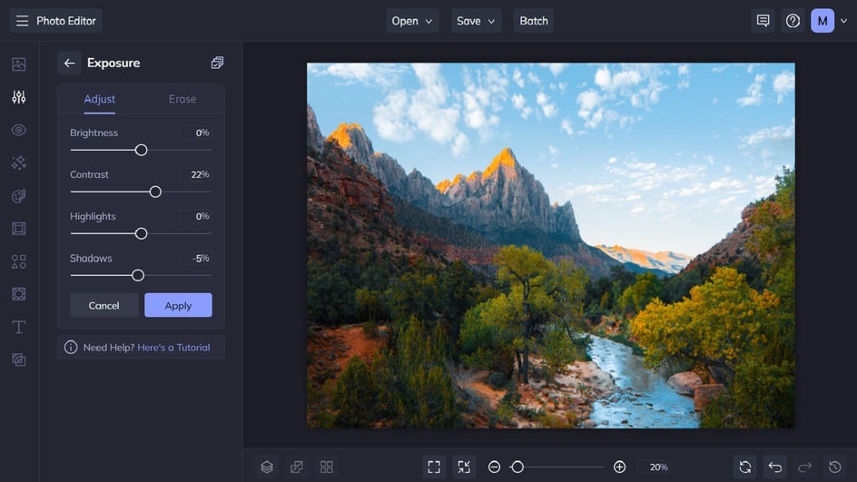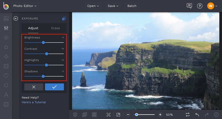 If your nature photo is under or overexposed, you can quickly and easily perfect it using BeFunky’s Exposure tool, located within the Edit menu. Simply move the sliders to adjust your image’s brightness, contrast, highlights, and shadows until you have your desired exposure.