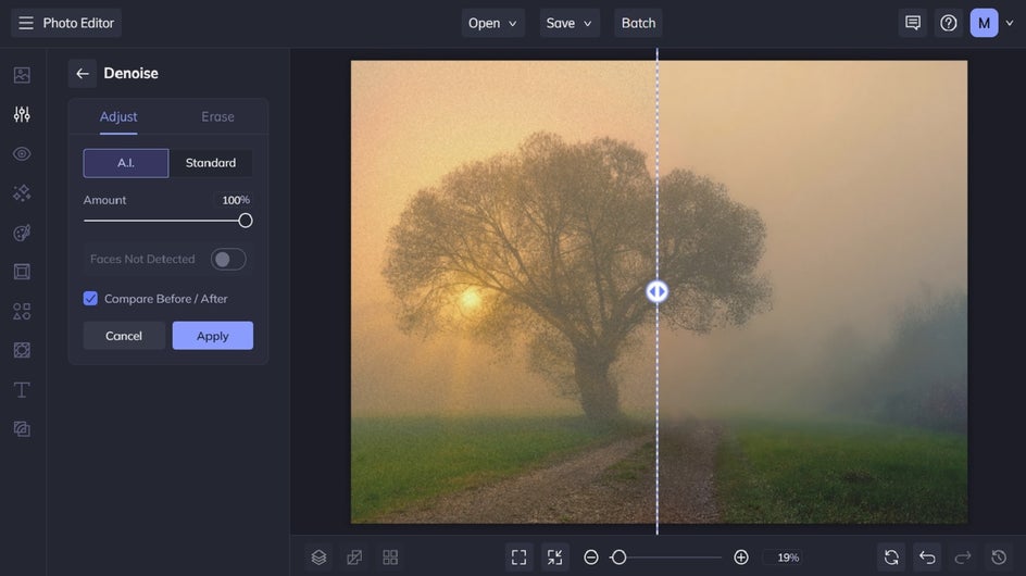 Rather than deleting an otherwise beautiful image, try using BeFunky’s Denoise tool located within the Edit menu underneath Smoothing. This tool utilizes Artificial Intelligence to denoise your image and get it picture-perfect in just seconds.