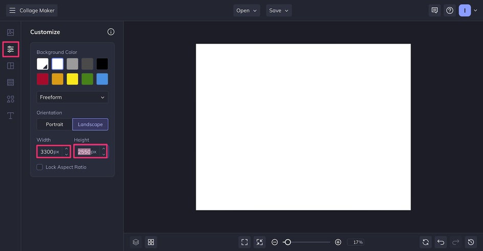For even more creative freedom, you can opt to Create Your Own layout. This is the method we’ll be using, as it lets us drag and drop images freely onto the canvas, and allows more flexibility in adding graphics and text. We’re also going to change the size in the Customize tab to 3300px x 2550px, so that later we can print it landscape on standard letter-size paper. If you’d rather make your vision board a background for your devices or post it on social media, you can change the dimensions to match. Either way, you can always edit the size at a later time!