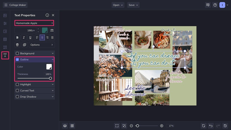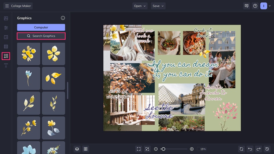 This New Year, don’t gear up for disappointment. With your vision board at the ready, you can meet your resolutions and take one step closer to where you want to be. As a bonus, you’ll be starting the year off with a fun, inspiring creative project. Just open up the Collage Maker to get started!