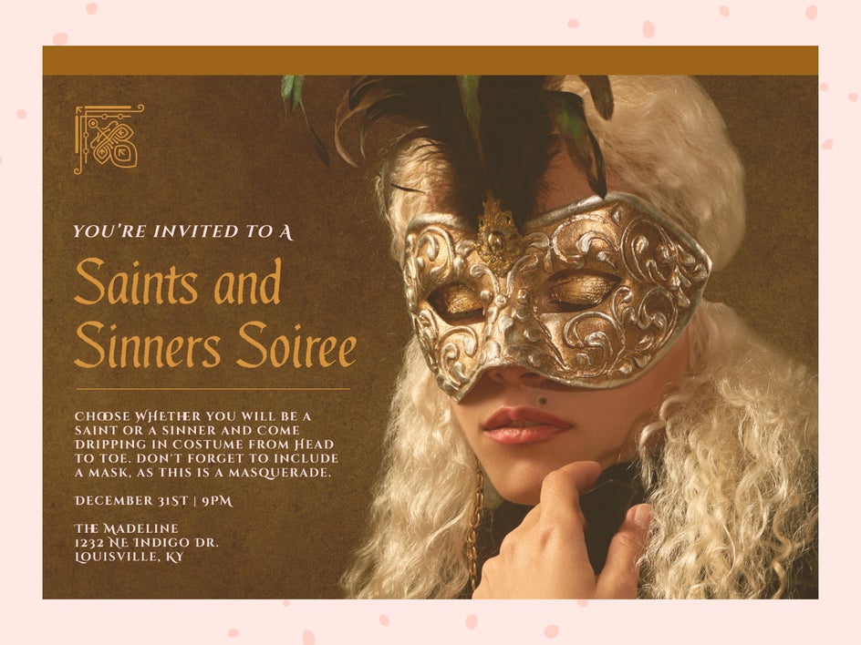 You can easily throw a simple masquerade party or host an even more elaborate soireè by doubling up on themes. You can have a Saints and Sinners Masquerade Ball or a Pajama Masquerade Party. If you need help creating an invitation from a BeFunky template, learn how to create the perfect holiday party invitations for any festive event. Once you are finished, easily export your invitation as a JPEG to email your guests for a more intimate invite.