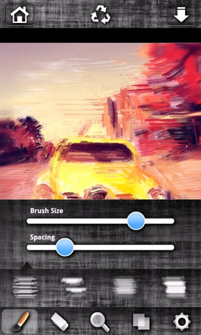 Choose the right brush. Feel free to adjust your brush size as you need to paint small or larger areas. Play around with the Spacing setting to adjust paint density. Try different brush types (below the sliders). They all create different patterns on your canvas.