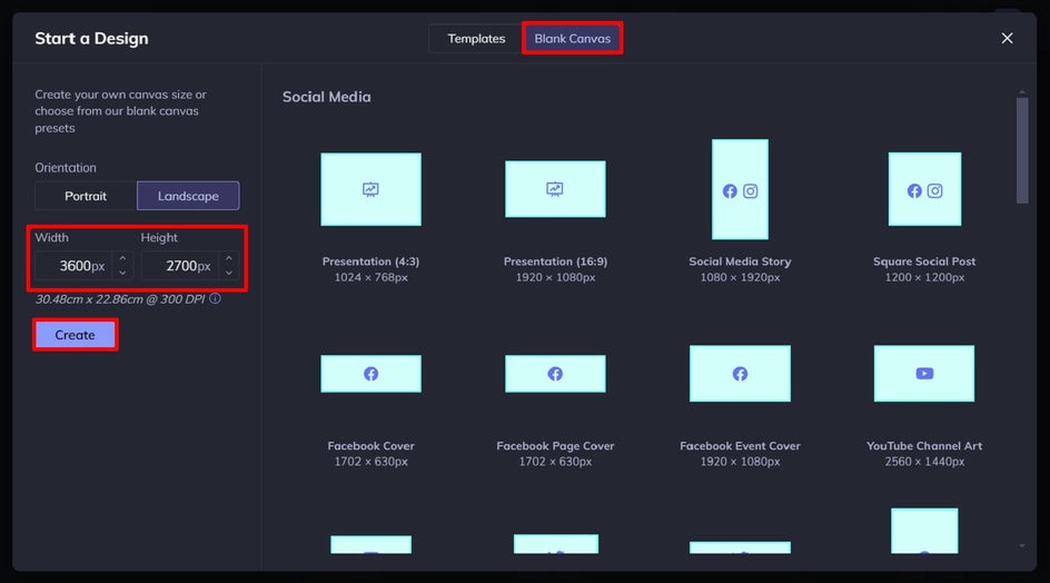 Click Blank Canvas at the top of the screen, then type in your desired width and height measurements on the left, followed by Create.