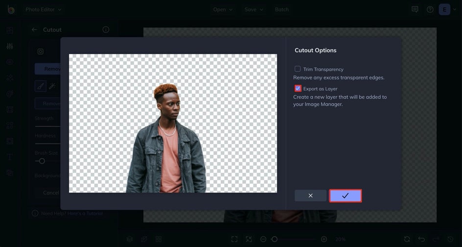 Once the background is removed, you’ll be left with the subject of your image layer. Click Apply and be sure Trim Transparency and Export as Layer are checked before clicking Apply again. This will create an image layer of the subject that you can add to your image from the Image Manager.