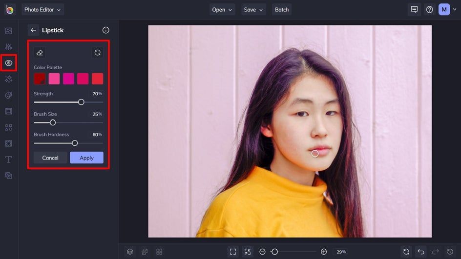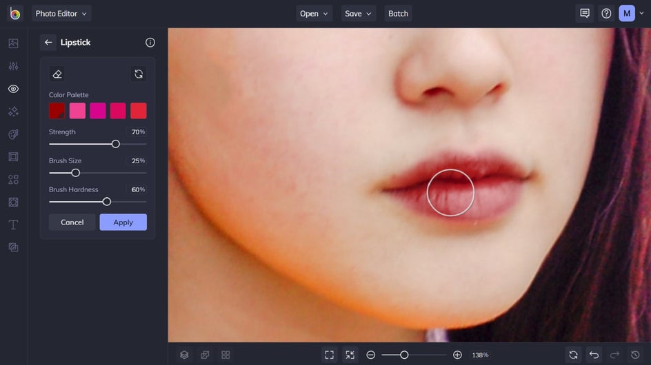When you click on a Touch Up tool, you’ll have the option to adjust the Brush Size, as well as other elements such as Strength, Brush Hardness, and even color – if applicable. For this example, we’re going to apply lipstick to a portrait.