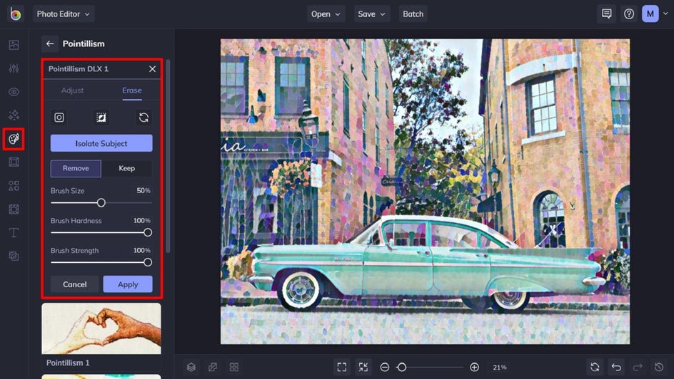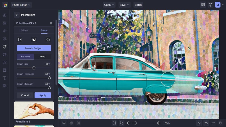 In this example, we wanted to keep the car true to life while leaving the photo’s background as a Pointillism-style artwork. Using the Paint Brush tool in this way is a great idea for creating a one-of-a-kind artwork!