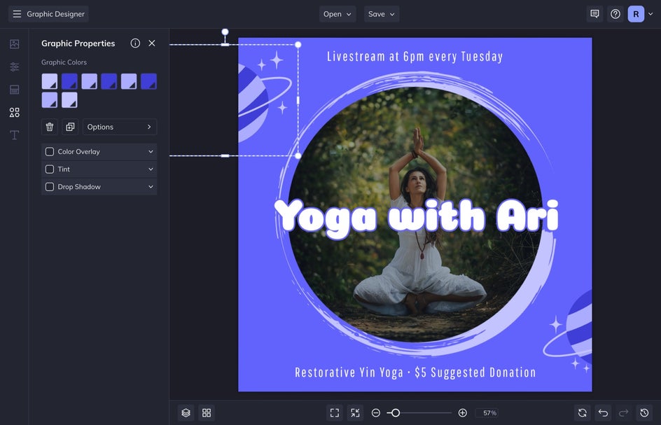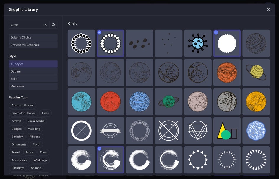 Click and drag them onto your canvas to position them where you want them. With the graphic selected, you can change the size or color, add an overlay, and more.