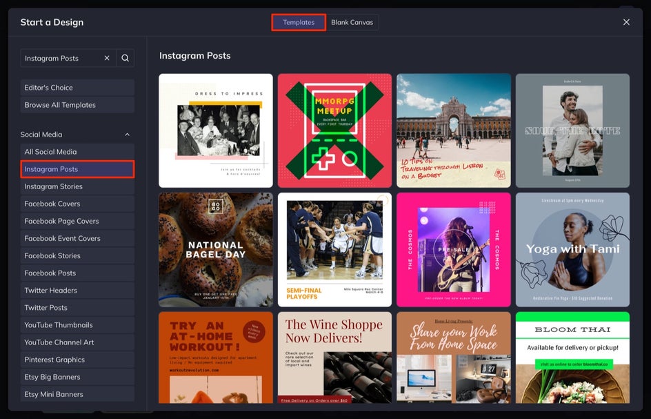 In the Graphic Designer, select the Templates tab at the top of your screen to choose from hundreds of pre-made templates. We are going to select Social Media and then Instagram Posts from the left-hand menu.
