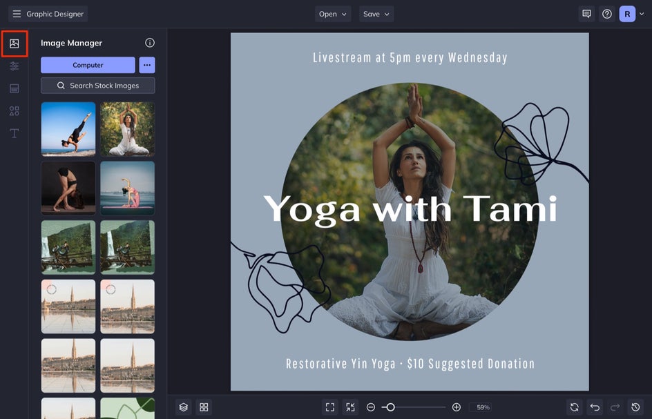 Head to Image Manager and select the image you want to use. We are using an image that fits the template best, but the clipping mask crops too much of the subject, and there isn't enough room to adjust the positioning. We're going to use the Expand tool to fix that!