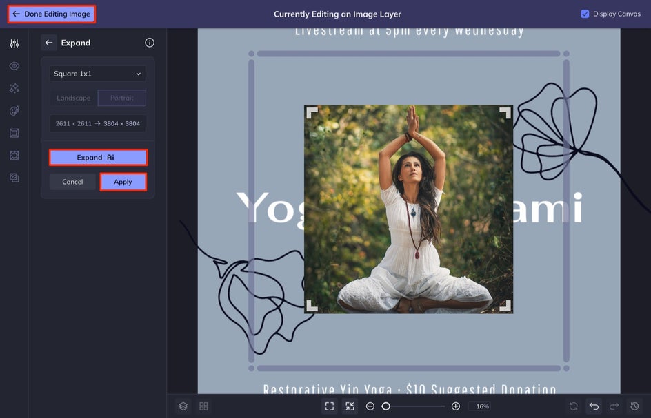 When you’ve repositioned your photo, select Expand AI. Then, click Apply and you're done! Or, you can use the Generate Again feature to regenerate the results.