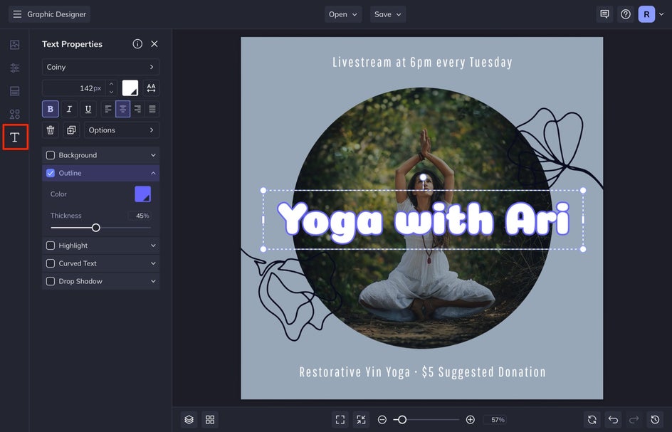 First, add your original text by selecting any of the text boxes. In the text properties menu, you can customize things like the font, color, and drop shadow. We changed the font and also added an outline to the title text.