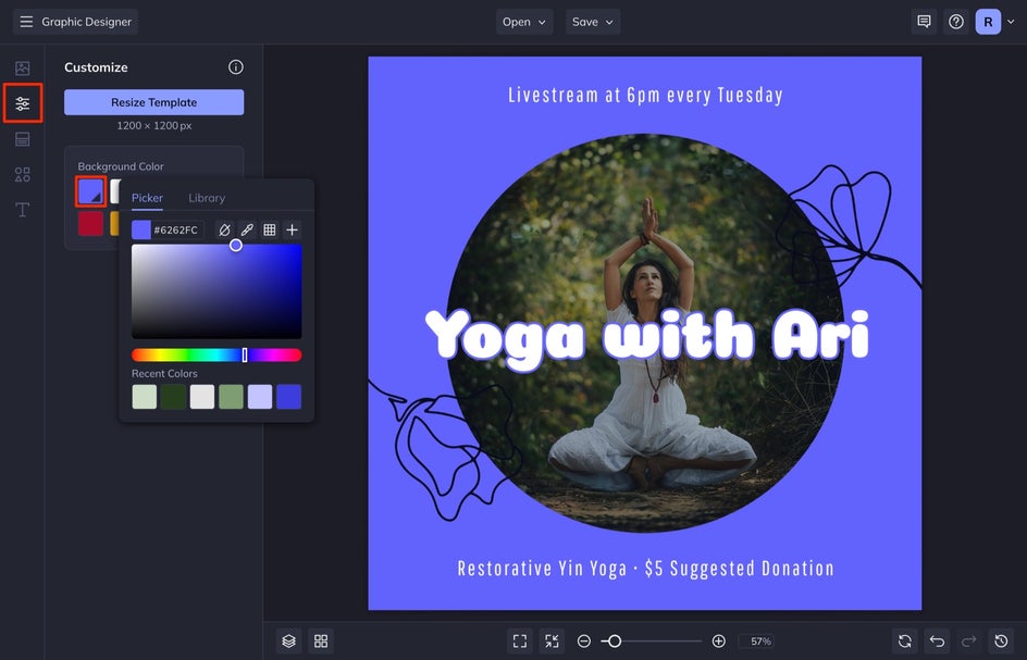 Next, customize the colors by selecting Customize from the left-hand menu. Select the first swatch to customize the background color.