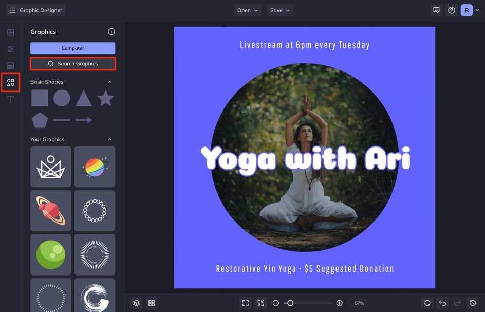 After this, we are going to replace the graphics within the template and add new ones that fit the overall theme. First, delete the unwanted graphics from your design by selecting them and hitting Delete on your keyboard. Select Graphics from the left-hand menu.