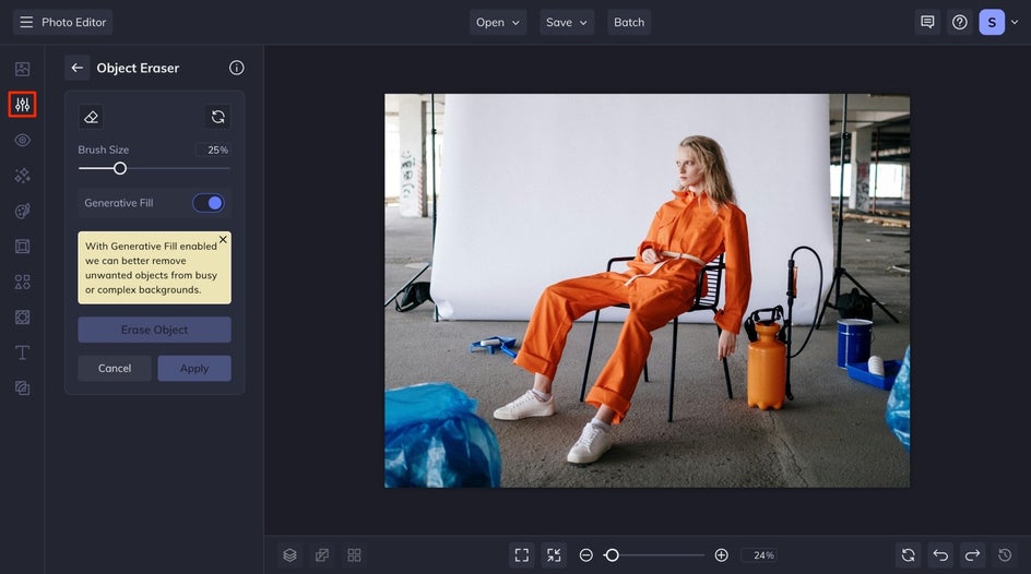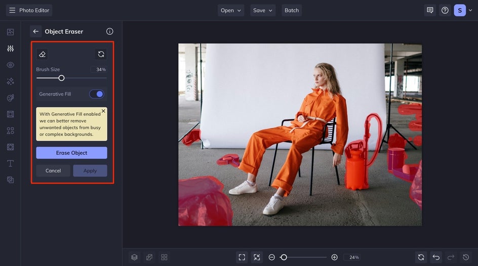 Use the Brush Size slider to adjust your selection tool. Carefully paint over the object you want to remove, getting as close to the edges as possible. If you need to refine your selection, use the Erase Selection brush to make adjustments. Once satisfied, click Erase Object to let AI seamlessly remove it from the image.