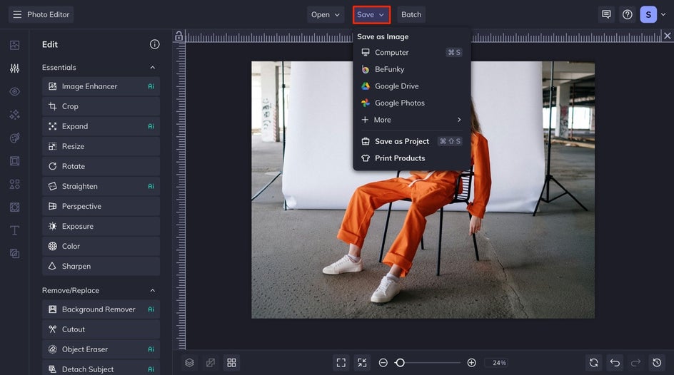 Once you're happy with your edits, click Apply, then click Save at the top of your canvas to save your high-quality image in the format of your choice – perfect for uploading to your blog, Poshmark listing, or Instagram feed.