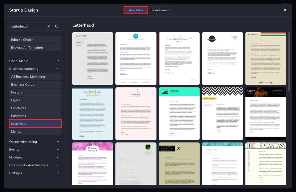 If you want to create your own letterhead, select the Blank Canvas tab at the top of the screen. If you are going to make one from a template like we are, select the Template tab, select Letterhead from the Business Marketing menu, and then choose the design you want. In the window that appears, select Use This Template.