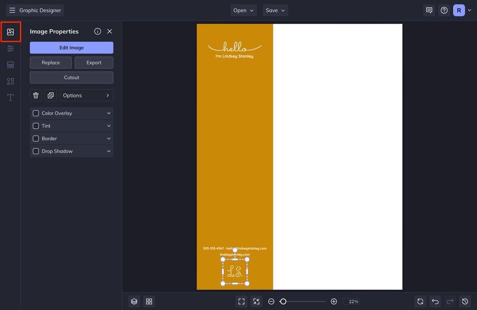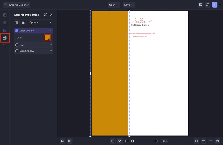 Select Graphics from the left-hand menu. We are going to adjust the long rectangle border on the left side of our letterhead to make it thicker, and then reorient the text to change up the design a bit.