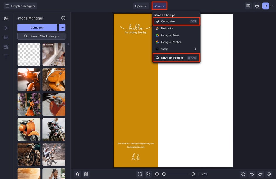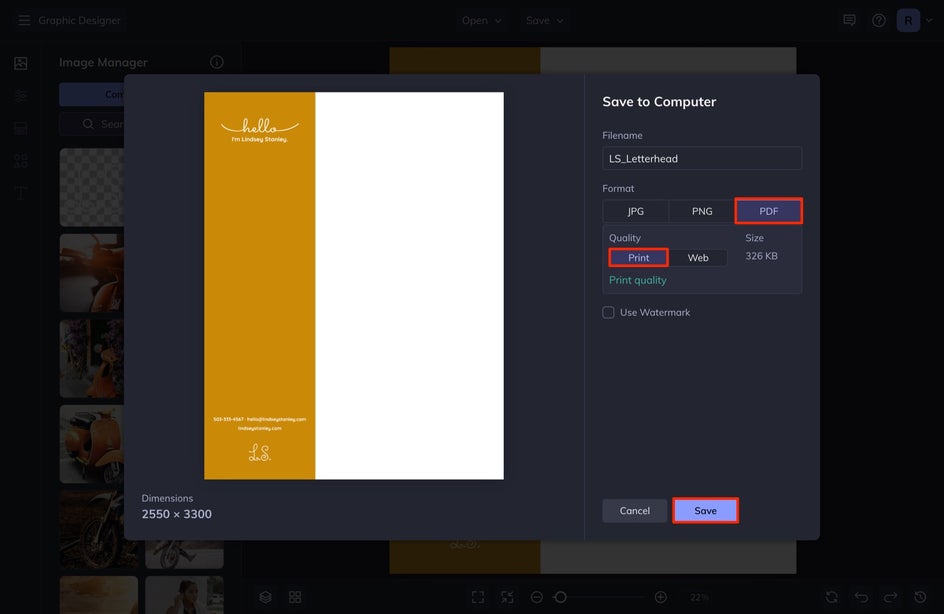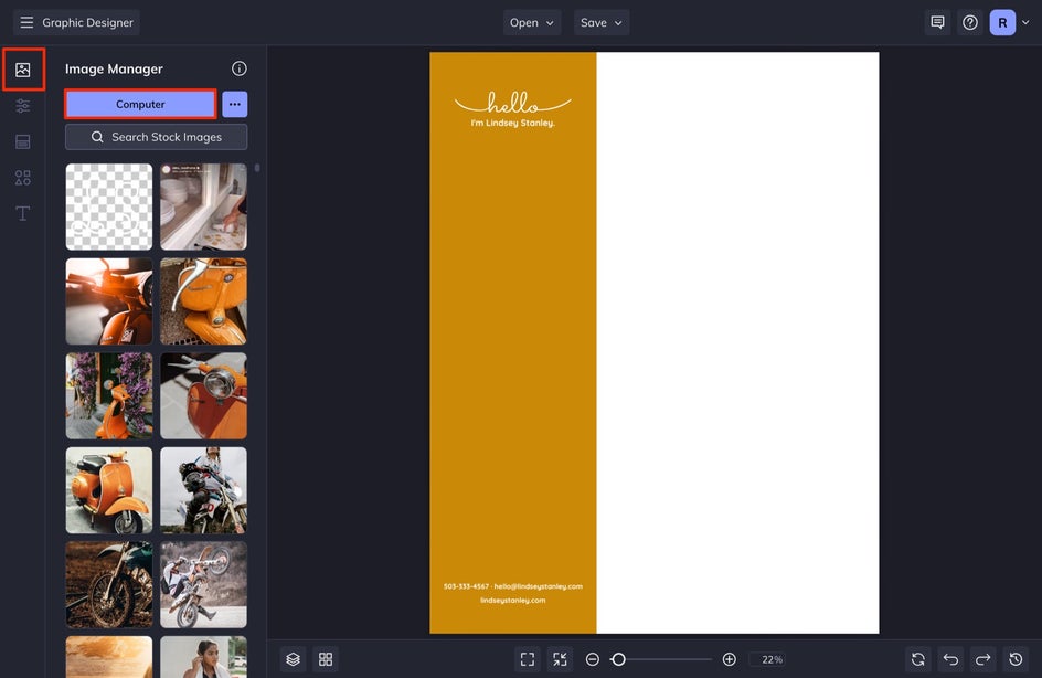 To add your logo to your letterhead, go to Image Manager and then select Computer. Locate your PNG file. Your logo file will appear in your Image Manager. Drag and drop your image onto the canvas. You can size it and position it wherever you’d like.