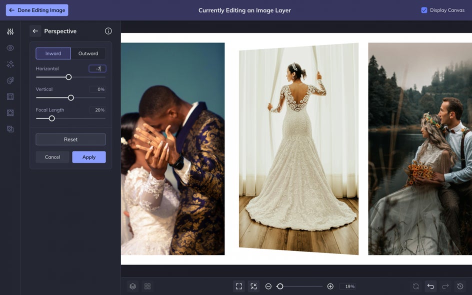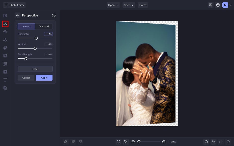 Landing on the Perspective tool, the Inward tab will be selected by default. From here, simply move the sliders left or right to adjust your photo’s angle, depth, and focal length. This tab can be used to create depth or completely warp your image.