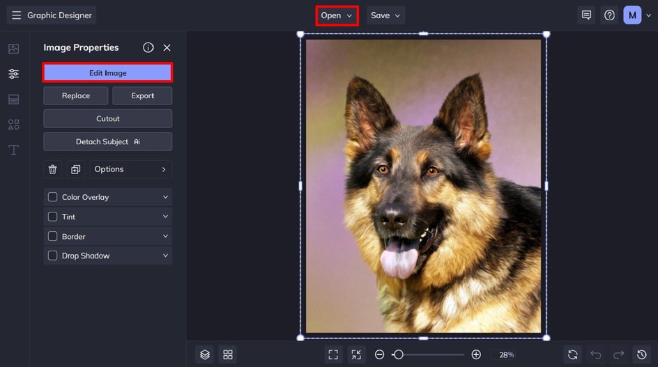 To create your own pet sketch, head to the Graphic Designer. Open your pet photo by clicking Open > Image. Then, follow these 4 steps!