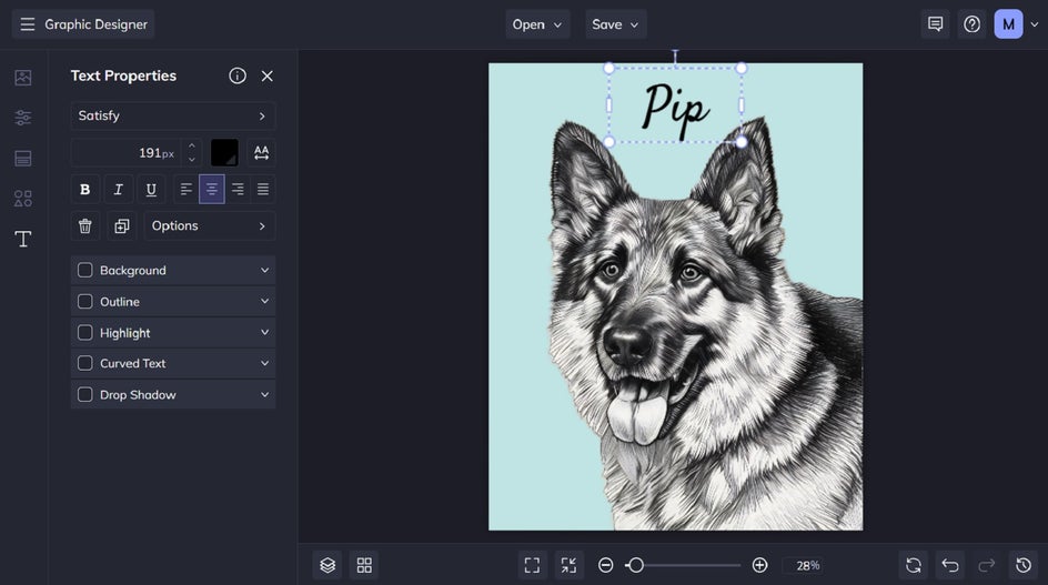 Double-click the textbox and type your pet’s name. Any time you have a textbox selected, a Text Properties panel will appear on the left. This is where you’re able to change the font, font color, letter spacing, typographical emphasis, and so much more.