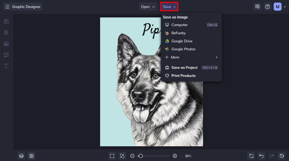 Once you’ve finished turning your pet into a sketch, click the Save button at the top of the page, then select your desired save location and file type.