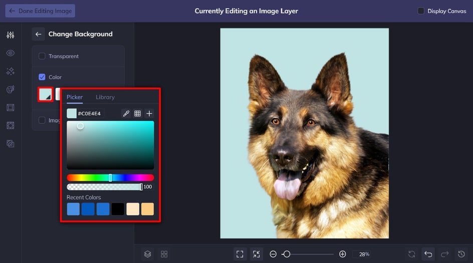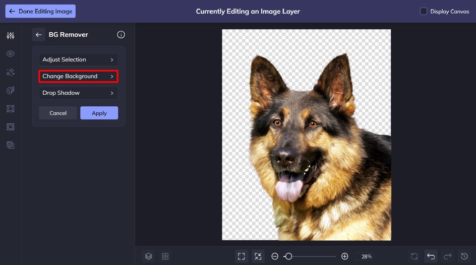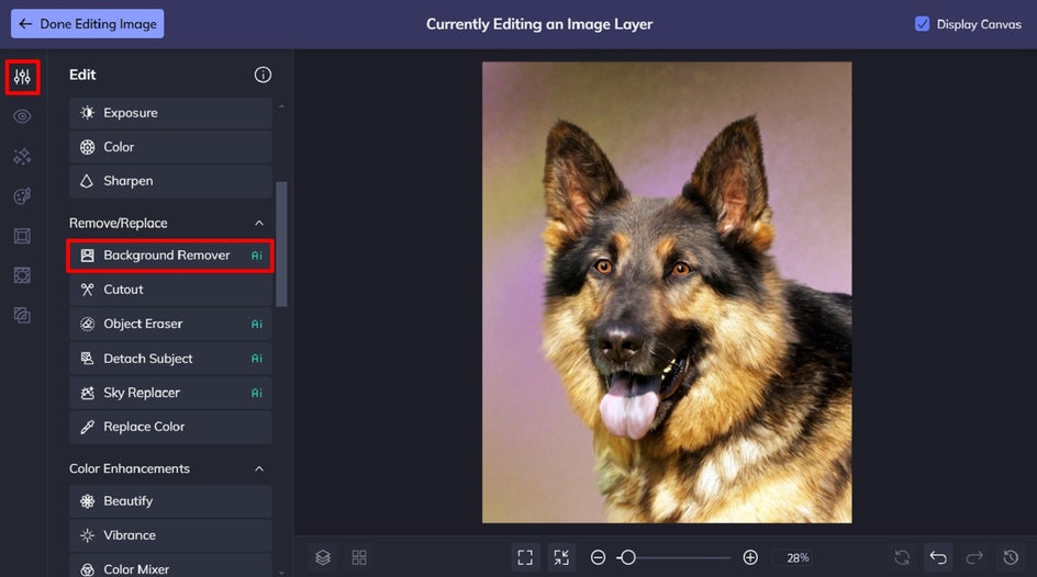 We’re going to replace the existing background in your pet image with a solid color. To do this, navigate to Edit > Background Remover.