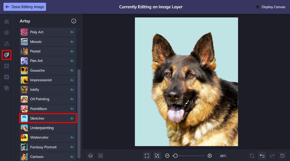 With your pet photo’s new colored background in place, it’s now time to add a Sketcher effect to your pet. Click Artsy in the main menu on the left, then scroll down to locate Sketcher.