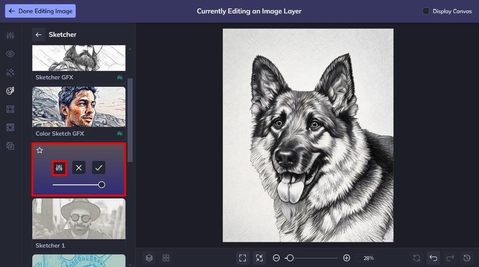 When you click on an effect, you can view a sample of how it looks on your pet portrait. Once you’ve decided which Sketcher effect is your favorite, click the left-most icon to open the Settings menu.