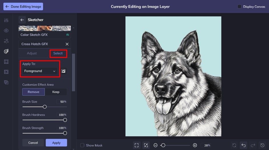 For this pet sketch, we’ve chosen the Cross Hatch GFX effect. We’re going to only apply the Sketcher effect to our pet and not the colored background. To do this, click on the Select tab, then underneath “Apply to:” select Foreground.