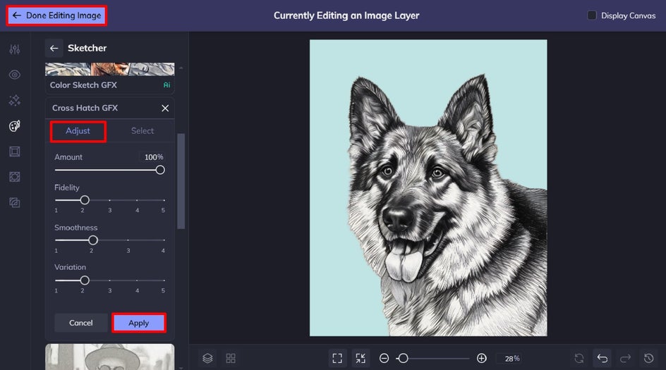 Next, click on the Adjust tab (located next to the Select tab). This allows you to customize your Sketcher effect further, including the Fidelity, Smoothness, and Variation. Once you’ve finished making your adjustments, click Apply, followed by Done Editing Image in the top-left corner.