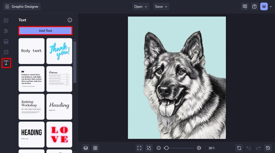 Back in the Graphic Designer, it’s time to add your pet’s name to your sketch. Click Text in the main menu on the left, followed by Add Text.
