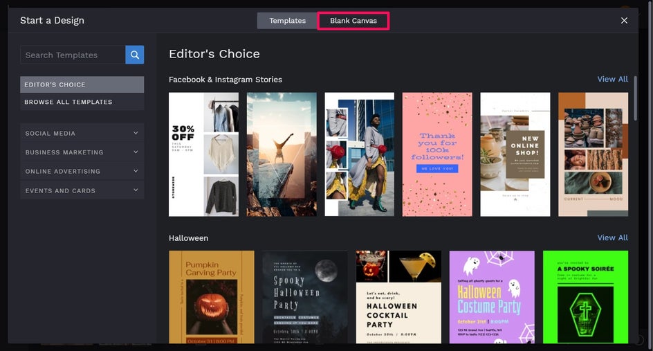 To get started, head to the Graphic Designer and start a new design. In the Templates Library, click on the Blank Canvas tab up the top, followed by Social Media Story.