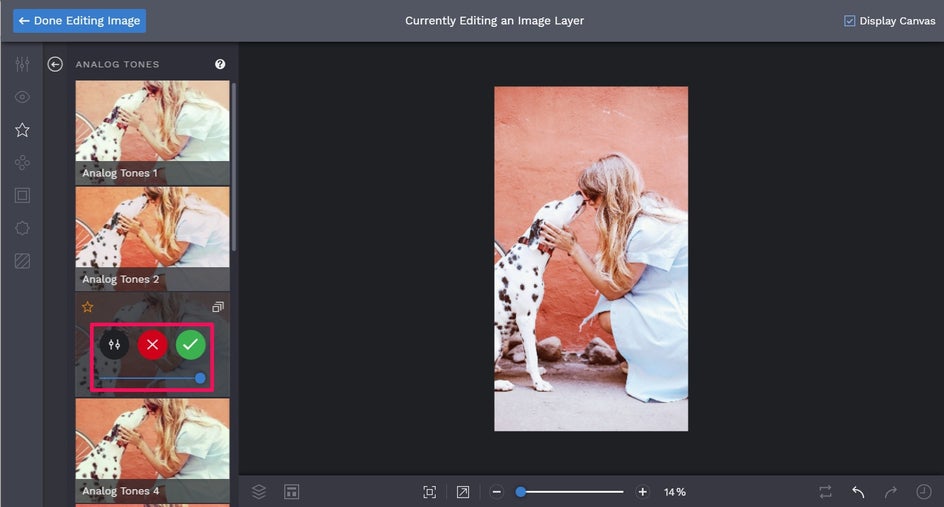 For this tutorial, we’re using Analog Tones 3. Click the green check button to Apply, the red cross button to Cancel, or the dark grey Settings button to make adjustments to the effect. Additionally, you can use the slider located underneath these buttons to increase or decrease the effect.