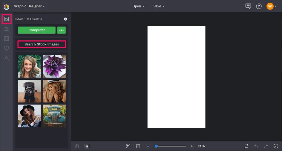 With your blank phone wallpaper template, we’re going to show you how you can first add a photo as the background. Navigate to the Image Manager in the main menu on the left, then from here, you can click the three dots to upload a photo of your choice from your BeFunky account, Facebook, or Google Photos. Alternatively, click Computer to upload a photo from your computer’s files.
