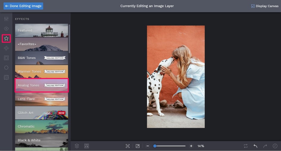 You can also add effects to make your photo background even more eye-catching. When you click on your image, an Image Properties panel appears. Click the Edit Image button and this will open your photo in the Photo Editor, giving you access to a wide range of photo effects. You can view these by navigating to Effects (the star symbol) from the main menu, then select an Effect category that takes your fancy.