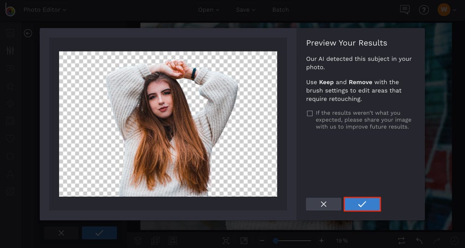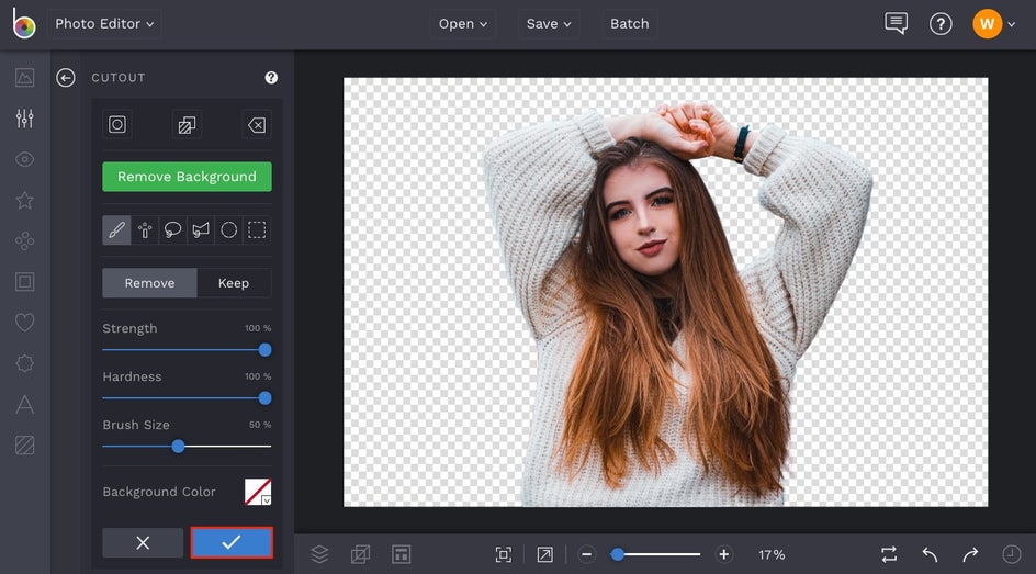 Within the Cutout Tool, click the Remove Background button. A preview of your image with the background removed will appear. If all looks good, click the blue checkmark button to continue.