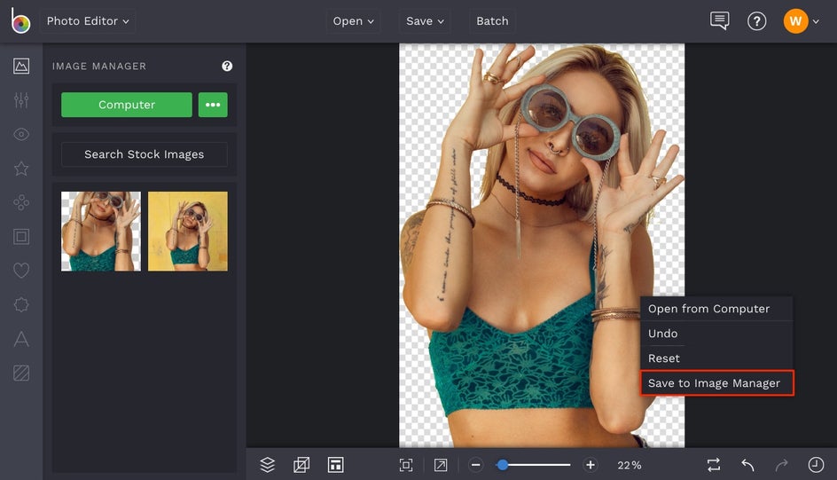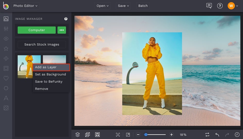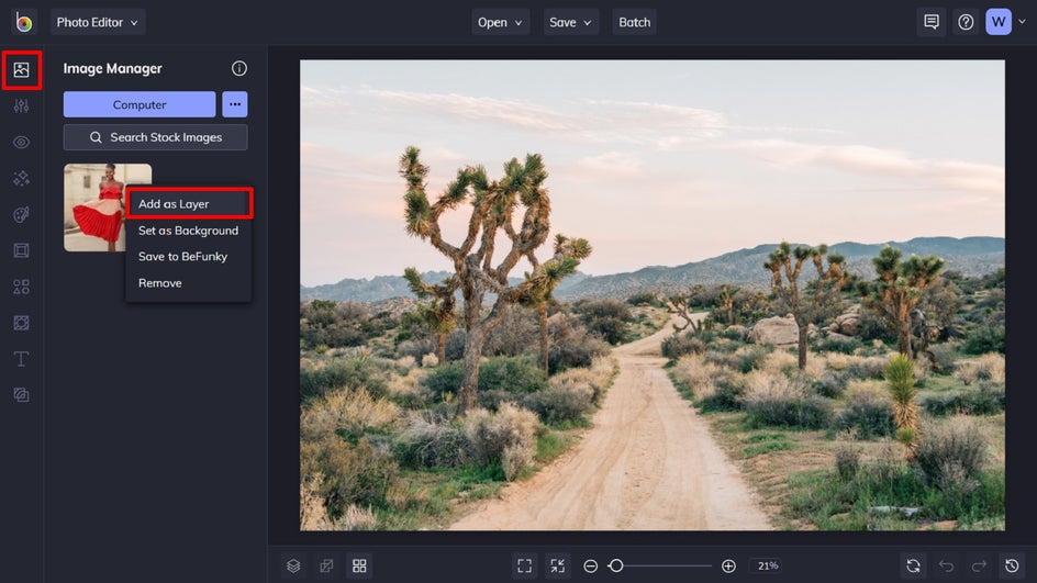 Click on the Image Manager tab in the main menu on the left. Then, you’ll want to upload the image you wish to use as a layer on top of your background image. Simply click the Computer button to upload images from your computer, click the ... button to access images on your BeFunky account or Facebook page, or click the Search Stock Images button to access our library of over a million free stock photos to use as layers.