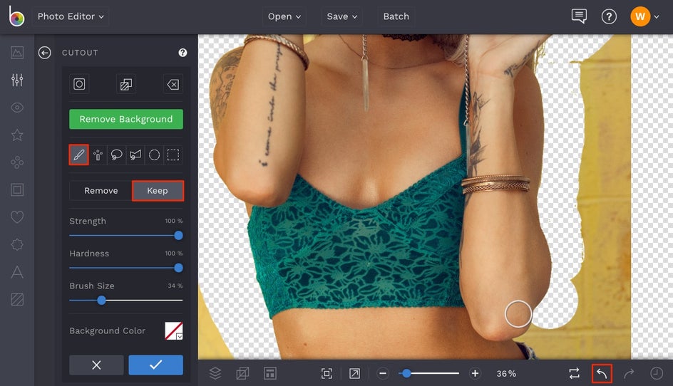 Once the outline of your object is transparent, you can continue removing the background of the remaining image. Here, we're using the Paint tool to quickly cut away the surrounding areas of the object.
