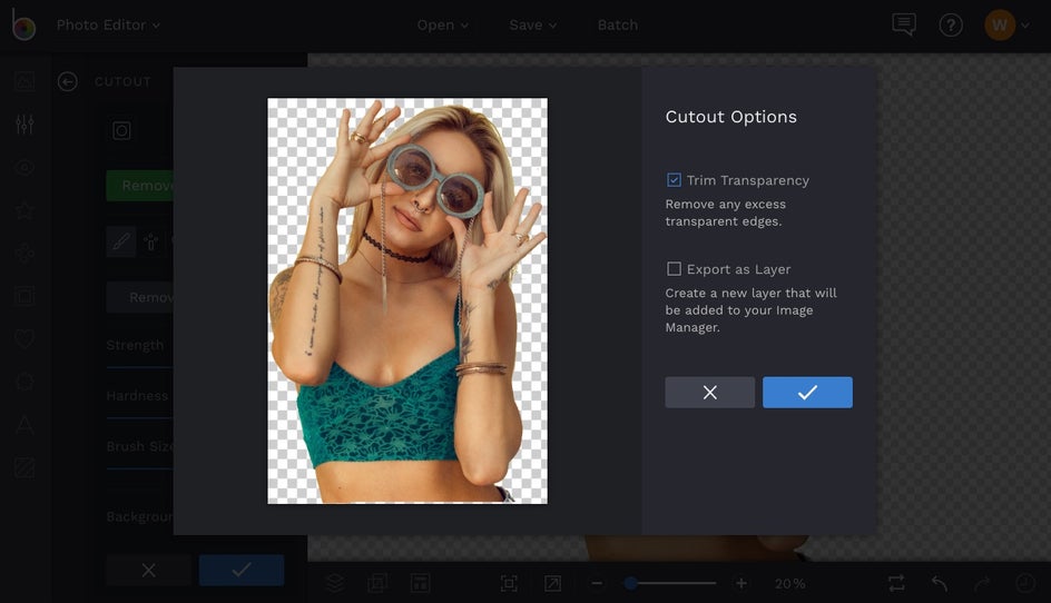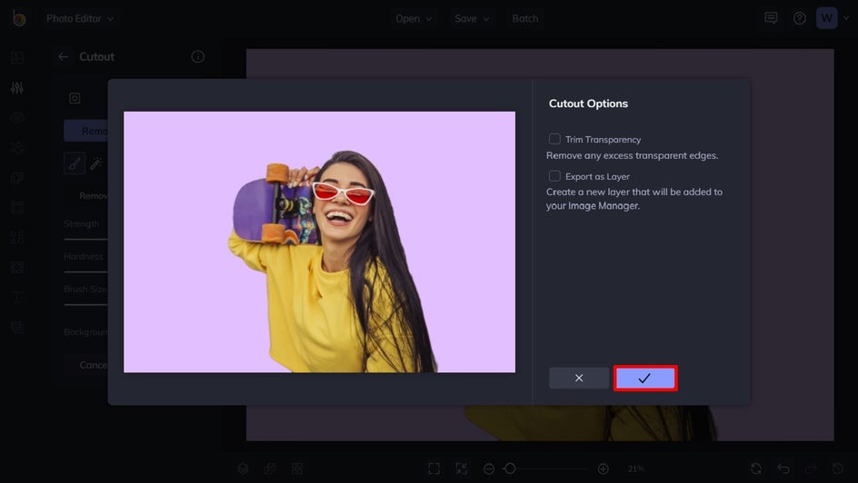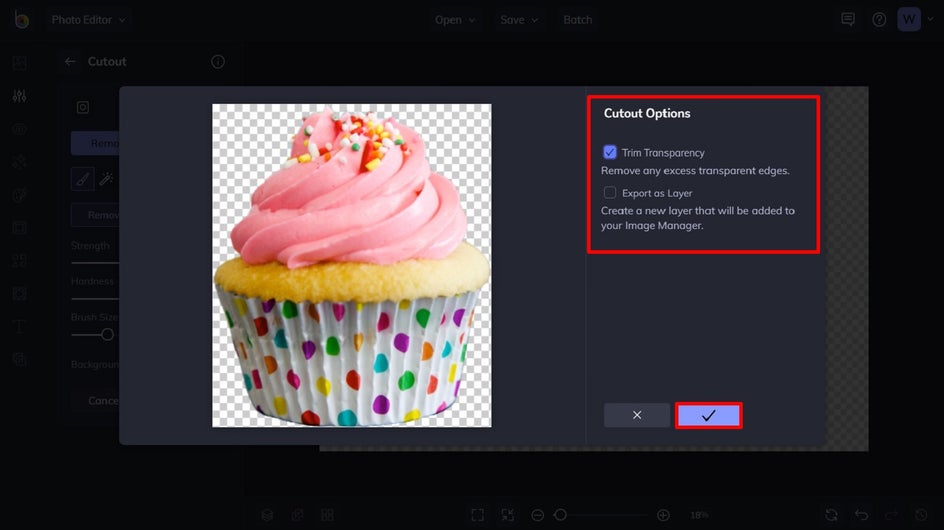 When you’re finished using the Cutout tool, click Apply and a Cutout Options menu will appear. In the menu, you’re able to select Trim Transparency if you’d like to crop out any additional transparent space around your object. When you check this box, a preview will be shown on the left. Checking the Export as Layer box will also add your cutout selection to the Image Manager, and will automatically add your cutout selection as a layer on top of your original image.