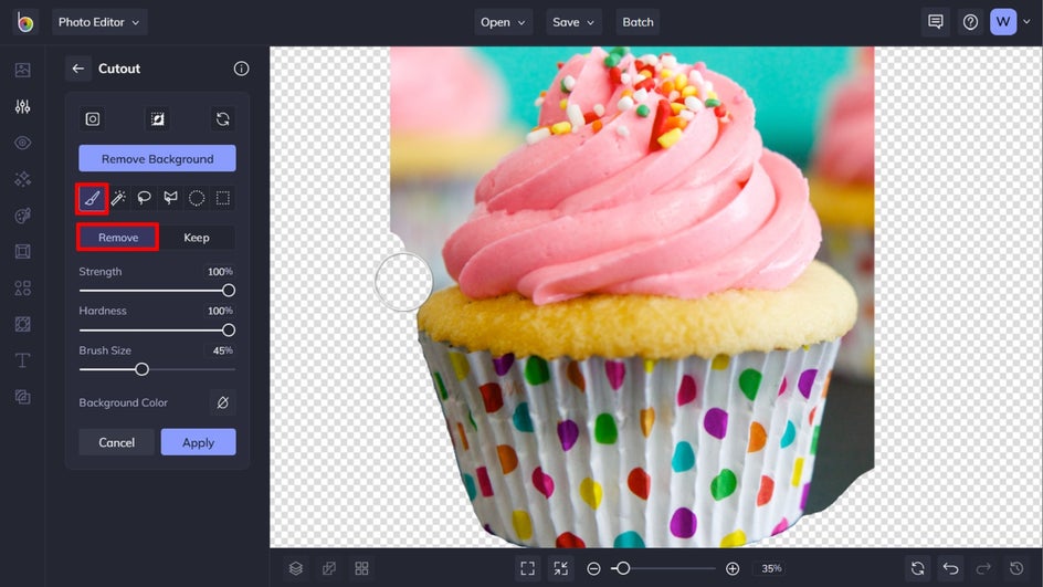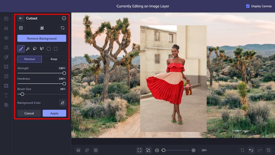 A Cutout toolbar will appear containing background removal options. To cut out your image layer with a brush, select the brush that most suits your needs and ensure the Remove button is selected. After adjusting brush options like Brush Size and Tolerance, use your mouse to paint around your subject and remove the background.