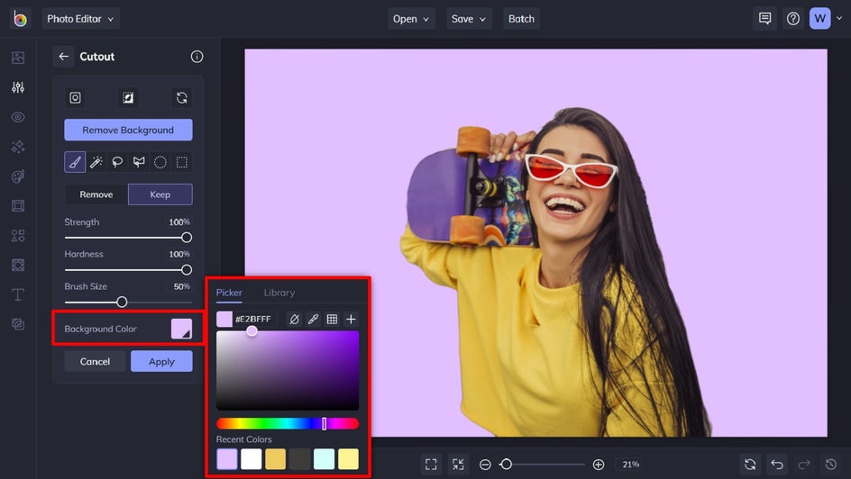 From here, you can keep the background transparent, choose a new background color to give your image a solid-colored background, or continue detailing your image with the Cutout tool brushes if need be.
