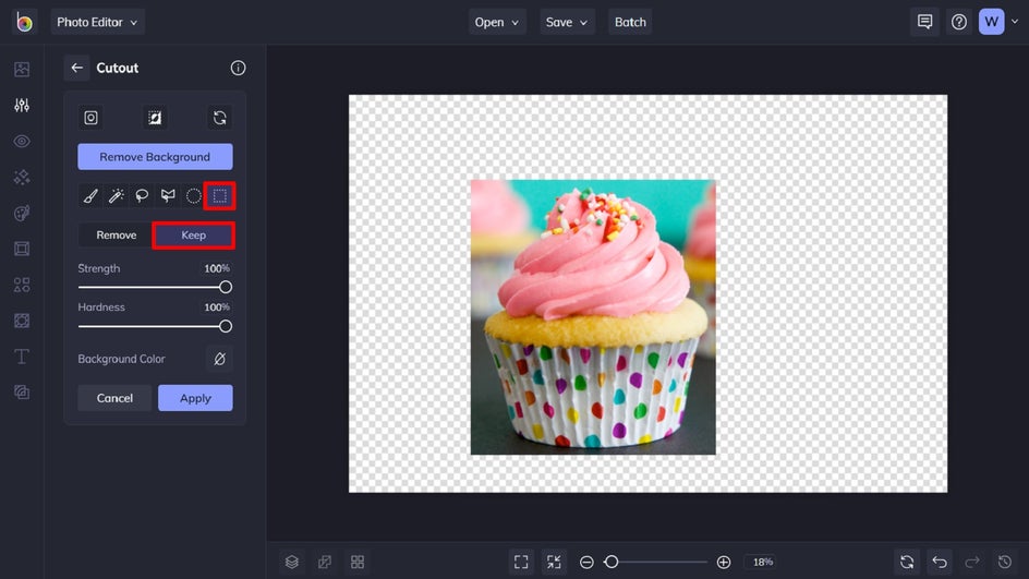 Alternatively, you can use the Remove Background button. Our Background Remover automatically detects the subject in your image and removes its surrounding background in just one click!