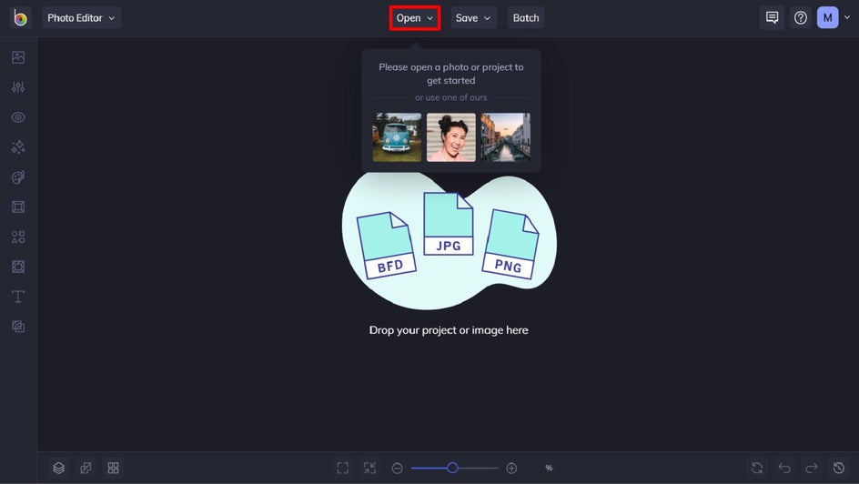 To get started with your own custom digital photo frame, head to the Photo Editor and click Open to open a photo of your choice.