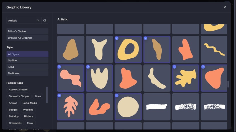 Within the Graphic Library, you can browse Editor’s Choice graphics, type your search term into the Search Bar, filter graphics by style, or browse Popular Tags. Then, simply click any graphics you wish to use in your design.