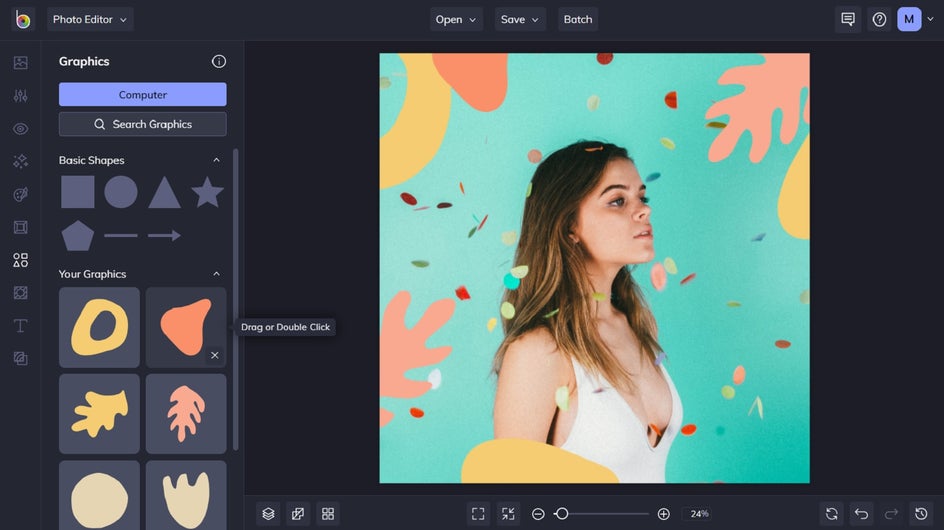 Simply drag and drop your graphics from the Your Graphics section to form a frame on your photo. You can resize graphics by selecting them with your cursor, then dragging the corners inwards (to make them smaller) or outwards (to make them larger). Additionally, you can move any graphic by clicking and dragging it into its new position. Be sure to take advantage of our alignment tools to make the process even easier!