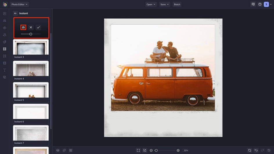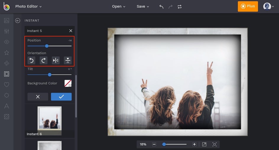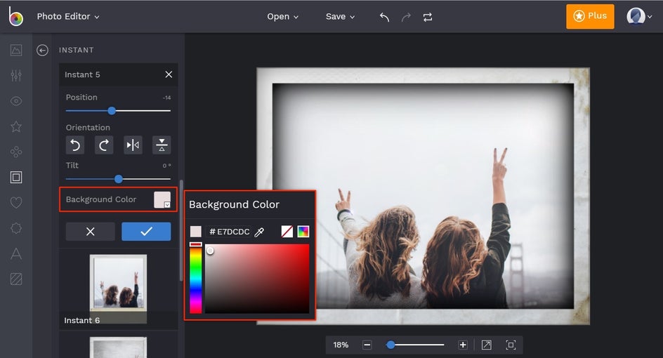 Now that we've settled on a frame, there are a few minor adjustments we'd like to make to the photo as a whole. By going to the Edit tab, you can change things such as the exposure, color, and more. You can also add text, graphics, or layer other effects. For these Instant frames, adding the date, time, or subjects may make it feel more like the real thing.